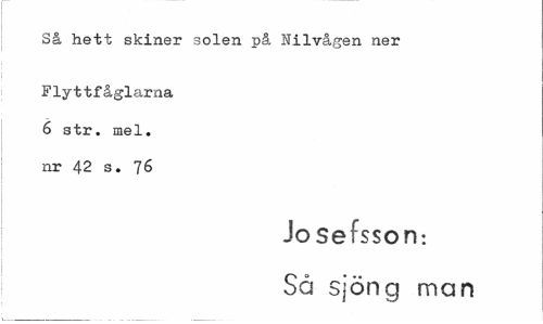 //// Så hett skiner solen på Ni1vågen ner //// Flyttfåglarna 6 str. mel. nr 42 s. 76 //// Josefsson: //// Så sjöng man ////