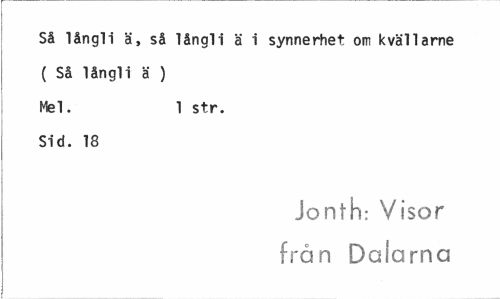 //// Så långli ä, så långli ä i synnerhet om kvällarne //// ( Så långli ä ) //// Mel. 1 str. //// Sid. 18 //// Jonth: Visor från Dalarna ////