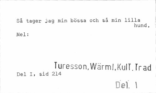 //// Så tager Jag min bössa och så min lilla //// hund. //// Mel: //// Turesson, Wärml,Kull. Träd //// Del I, sid 214 //// Det. 1 ////