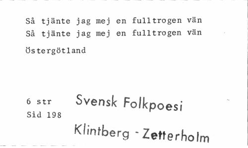 //// Så tjänte jag mej en fulltrogen vän Så tjänte jag mej en fulltrogen vän //// Östergötland //// 6 str Svensk Folkpoesi //// Sid 198 //// Klintberg "Zetterhoim ////
