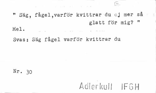 //// " Säg, fågel,varför kvittrar du ej mer så //// glatt för mig? " //// Mel. //// Svas: Säg fågel varför kvittrar du Nr. 30 //// Adierkull IFGH ////