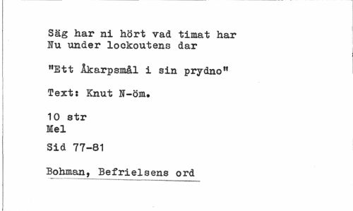 //// Säg har ni hört vad timat har Hu under lockoutens dar //// "Ett Åkarpsmål i sin prydno" //// Text: Knut N-öm. //// 10 str Mel //// Sid 77-81 //// Bohman, Befrielsens ord ////