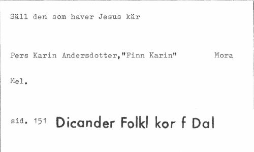 //// Säll den som haver Jesus kär //// Pers Karin Andersdotter,"Finn Karin" Mora //// Mel. //// sid. 151 Dicander Foikl kor f Dai ////