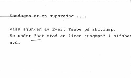 //// Söndagen är en suparedag ... //// Visa sjungen av Evert Taube på skivinsp. Se under "Det stod en liten jungman" i alfabe avd. ////