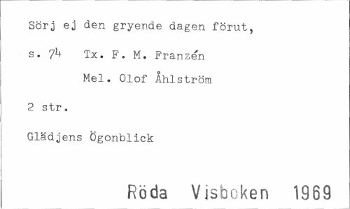 //// Sörj ej den gryende dagen förut, //// s. 7k Tx. F. M. Franzén Mel. Olof Åhlström //// 2 str. //// Glädjens Ögonblick //// Röda Visboken 1969 ////