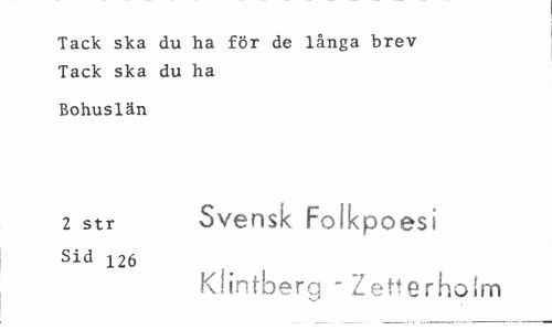 //// Tack ska du ha för de långa brev Tack ska du ha //// Bohuslän //// 2 str Svensk Folkpoesi Sid 126 //// Klintberg "Zetterholm ////