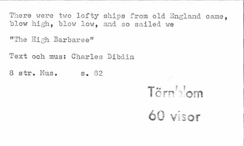 //// There were two lofty ships from old England came, blow high, blow low, and so sailed we //// "The High Barbaree" //// Text och mus: Charles Dibdin //// 8 str. Mus. s. 82 //// « « f I //// I c r^ om 60 visor ////
