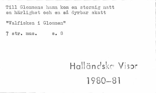 //// Till Glommens hamn kom en stormig natt en härlighet och en så dyrbar skatt //// "Valfisken i Glommen" //// 7 str. mus. s. 8 //// Halländske Visor //// 1980-81 ////