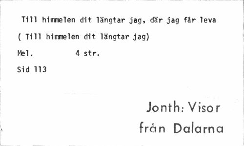 //// Till himmel en dit längtar jag, där jag får leva ( Till himmel en dit längtar jag) Mel. 4 str. //// Sid 113 //// Jonth: Visor från Dalarna ////