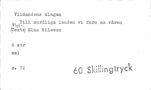 //// Vildandens klagan //// H Till nordliga landen vi foro om våren /»eA-- //// Text: Elna Nilsson //// 6 str mel //// s- 72 60 Skiiiingtryck ////