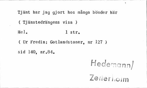 //// Tjänt har jag gjort hos många bönder här ( Tjänstedrängens visa ) Mel. 1 str. //// ( Ur Fredin: Gotlandstoner, nr 127 ) sid 140, nr.84. //// Hedernann/ Zerierhoim ////