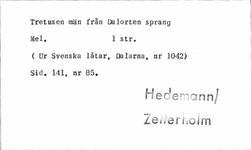 //// Tretusen män från Dalorten sprang Mel. 1 str. //// ( Ur Svenska låtar, Dalarna, nr 1042) Sid. 141, nr 85. //// Hecfemanri/ Zeiierhoim ////