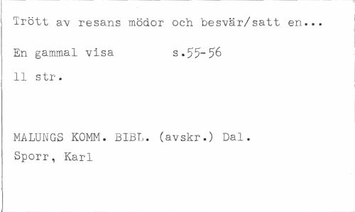 //// Trött av resans mödor och "besvär/satt en... //// En gammal visa s.55-56 11 str. //// MALUNGS KOMM. BIBL. (avskr.) Dal. Sporr, Karl ////