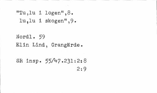 //// "Tu,lu i logen",8. lu,lu i skogen",9» //// Nordl. 59 //// Elin Lind, Grangärde. //// SR insp. 55A7.231:2:8 //// 2:9 ////