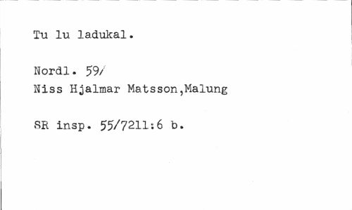 //// Tu lu ladukal. Nordl. 59/ //// Niss Hjalmar Matsson,Malung SR insp. 55/7211:6 b. ////