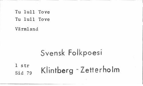 //// Tu lull Tove Tu lull Tove //// Värmland //// Svensk Folkpoesi sid^?9 Klintberg -Zetterholm ////