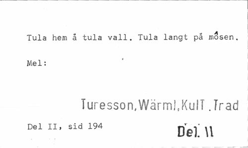 //// Tula hem å tula vall. Tula långt på mosen. Mel: //// Turesson, Wärml.KulT Jracf //// Del II, sid 194 ^ ////