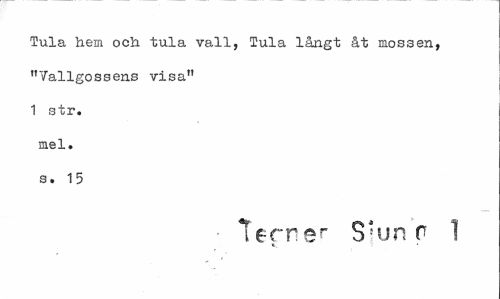 //// Tula hem och tula vall, Tula långt åt mossen, "Vallgossens visa" 1 str. mel. s. 15 //// Tcrner S'un v 1 ////