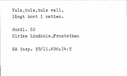//// Tula,tula,tula vall, långt bort i natten. //// Norell. 62 //// Ulrika Lindholm,Frostviken SR insp. 58/11.696:1^:5 ////