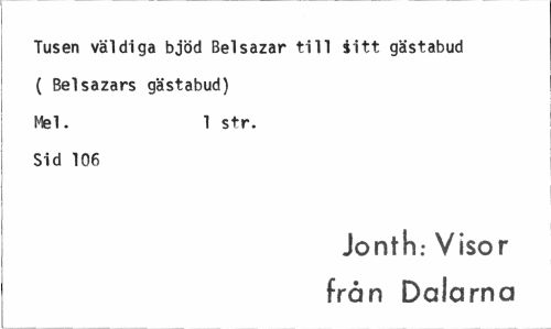 //// Tusen väldiga bjöd Belsazar till sitt gästabud ( Belsazars gästabud) Mel. 1 str. //// Sid 106 //// Jonth: Visor från Dalarna ////
