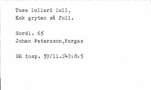 //// Tuss lulleri lull, Kok grytan så full. //// Nordl. 65 //// Johan Petersson,Pargas SR insp. 57/11•1^2:8:5 ////