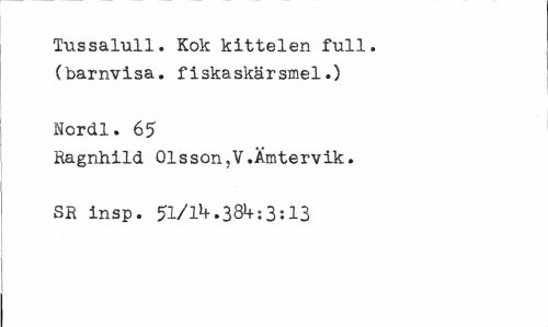 //// Tussalull. Kok kittelen full. (barnvisa, fiskaskärsmel.) //// Nordl. 65 //// Ragnhild Olsson,V.Åmtervik. SR insp. 51/1*+.38*+:3:13 ////