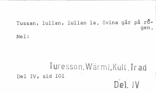 //// Tussan, Tullan, lullan la. Svina går på rö- //// gen. //// Mel: //// Turesson,Wärml, Kult. Trad //// Del IV, sid 101 //// De), i V ////