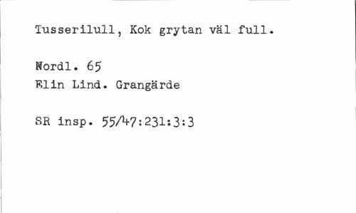 //// Tusserilull, Kok grytan väl full. Mordl. 65 //// Elin Lind. Grangärde SR insp. 55A7: 231:3:3 ////