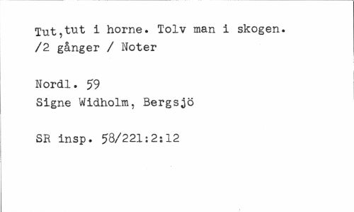//// Tut,tut i horne. Tolv man i skogen. /2 gånger / Noter //// Nordl. 59 //// Signe Widholm, Bergsjö SR insp. 58/221:2:12 ////