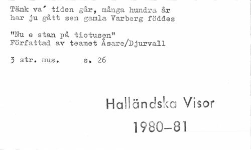 //// Tänk va' tiden går, många hundra år har ju gått sen gamla Yarberg föddes //// "Nu e stan på tiotusen" Författad av teamet Åsare/l)jurvall //// 3 str. mus. s. 26 //// Halländska Visor 1980-81 ////