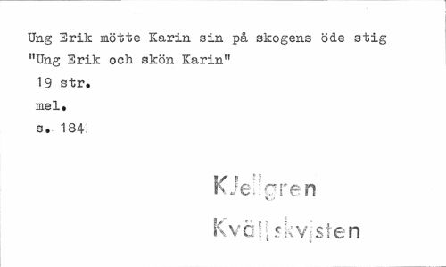 //// Ung Erik mötte Karin sin på skogens öde stig "Ung Erik och skön Karin" 19 str. mel, s. 184 //// KJe^oren //// i,» //// KvcHrkVjSten ////