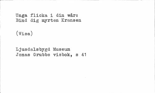 //// Unga flicka i din wårs Bind dig myrten Kransen //// (Wisa) //// Ljusdalsbygd Museum Jonas Grubbs visbok, s 41 ////