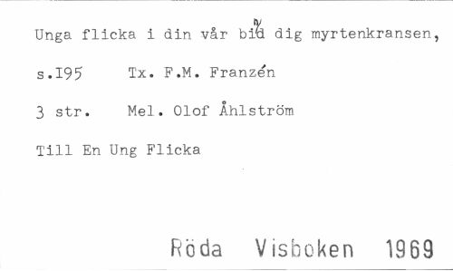 //// ty //// Unga flicka i din vår bi'd dig myrtenkransen, s.195 Tx. F.M. Franzén 3 str. Mel. Olof Åhlström Till En Ung Flicka //// Röda Visboken 1969 ////