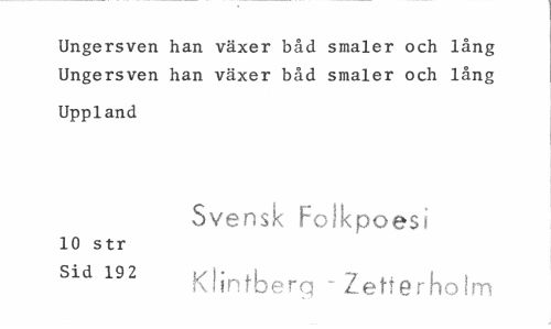 //// Ungersven han växer båd småler och lång Ungersven han växer båd småler och lång //// Uppland //// Svensk Folkpoesi //// 10 str //// Sld 192 Klintberg - Zetrerholm ////
