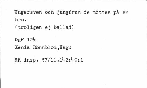 //// Ungersven och jungfrun de möttes på en bro. //// (troligen ej ballad) DgF 12b //// Xenia Rönnblom,Nagu SR insp. 57/ll.llf2:1+Oil ////