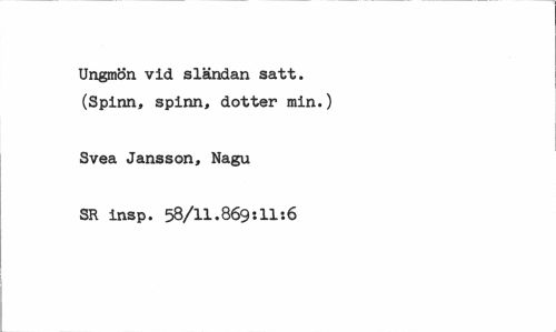 //// Ungmön vid sländan satt. (Spinn, spinn, dotter min.) //// Svea Jansson, Nagu //// SR insp. 38/11.869:11:6 ////