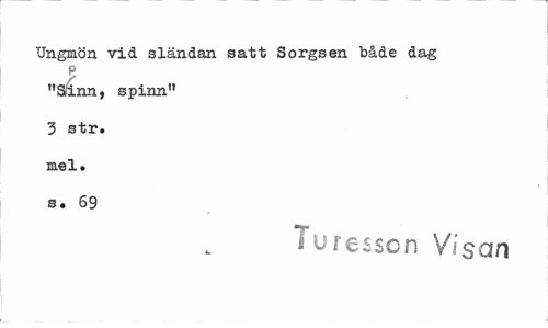 //// Ungmön vid sländan satt Sorgsen både dag //// P //// / //// "Sinn, spinn" 3 str. mel. s. 69 //// Turesson Visan ////