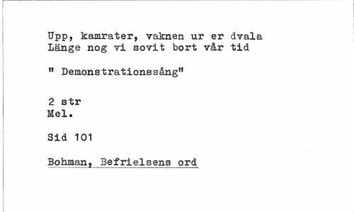 //// Upp, kamrater, vaknen ur er dvala Länge nog vi sovit bort vår tid //// " Demonstrationssång" //// 2 str Mel. //// Sid 101 //// Bohman, Befrielsens ord ////