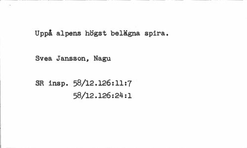 //// Uppå alpens högst belägna spira. //// Svea Jansson, Nagu //// SR insp. 58/12.126:11:7 58/12.126:24:1 ////