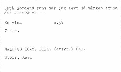 //// Uppå jordens rund där jag levt så mången stund /så förnöjder... //// En visa s -3*+ //// 7 str. //// MALUNGS KOMM. BIBL. (avskr.) Dal. Sporr, Karl ////