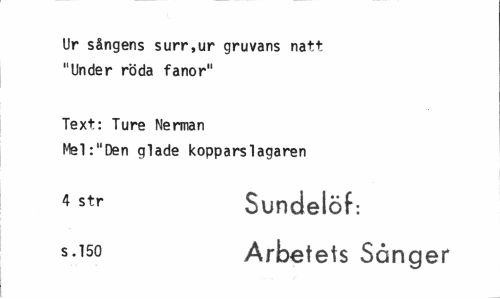 //// Ur sångens surr,ur gruvans natt "Under röda fanor" //// Text: Ture Nerman //// Mel:"Den glade kopparslagaren //// 4 str Sundelöf: //// s.i5o Arbetets Sånger ////