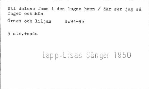 //// Uti dalens famn i den lugna hamn / där ser jag så fager och skön //// Örnen och liljan s.94-95 5 str.+coda //// Lapp-Lisas Sånger 1850 ////