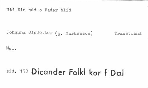 //// Uti Din nåd o Fader blid //// Johanna Olsdotter (g. Markusson) Transtrand //// Mel. //// sii- 158 Dicander Foikl kor f Dal ////