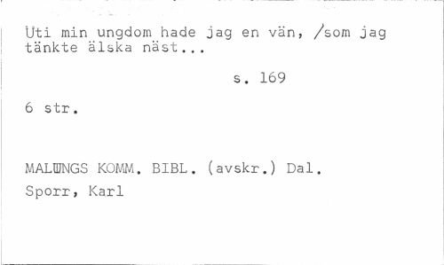 //// Uti min ungdom hade jag en vän, /som jag tänkte älska näst... //// s. 169 //// 6 str. //// MALDM3S KOMM. BIBL. (avskr.) Dal. Sporr, Karl ////