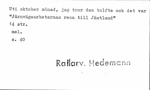 //// Uti oktober månad, jag tror den tolfte ock det var "Järnvägsarbetarnas resa till Jämtland" 14 str. mel. s. 40 //// Rollarv. Hedemcnn ////