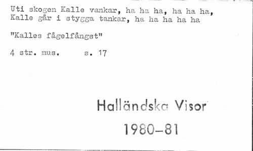 //// Uti skogen Kalle vankar, ha ha ha, ha ha ha, Kalle går i stygga tankar, ha ha ha ha ha //// "Kalles fågelfångst" //// 4 str. mus. s. 17 //// Halländske Visor //// 1980-81 ////