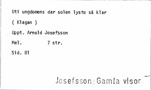 //// Uti ungdomens dar solen lyste så klar ( Klagan ) //// Uppt. Arnold Josefsson Mel. 7 str. //// Sid. 81 //// Josefsson: Gamia visor ////