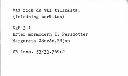 //// Vad fick du väl tillbästa. (Inledning berättas) //// DgF 3*fl //// Efter mormodern I. Persdotter Margareta Jönzén,Röjan //// SR insp. 53/33.769i2 ////
