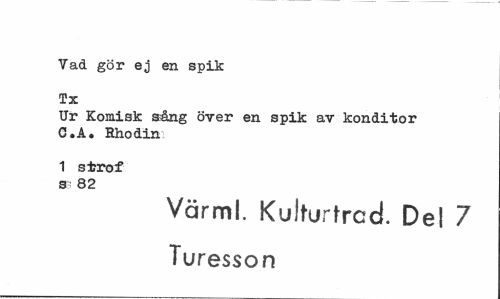 //// Vad gör ej en spik Tx //// Ur Komisk sång över en spik av konditor C.A. Rhodin //// 1 strof //// sr 82 //// Värml. Kulturtrcd. Del 7 Turesson ////