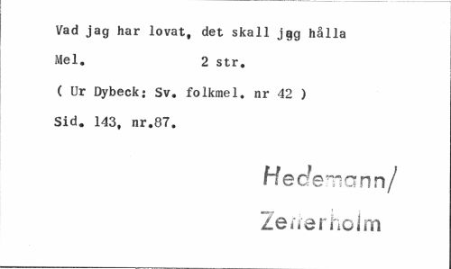 //// Vad jag har lovat, det skall j§g hålla Mel. 2 str. //// ( Ur Dybeck: Sv. folkrael. nr 42 ) Sid. 143, nr.87. //// Hedemann/ Zerterholm ////